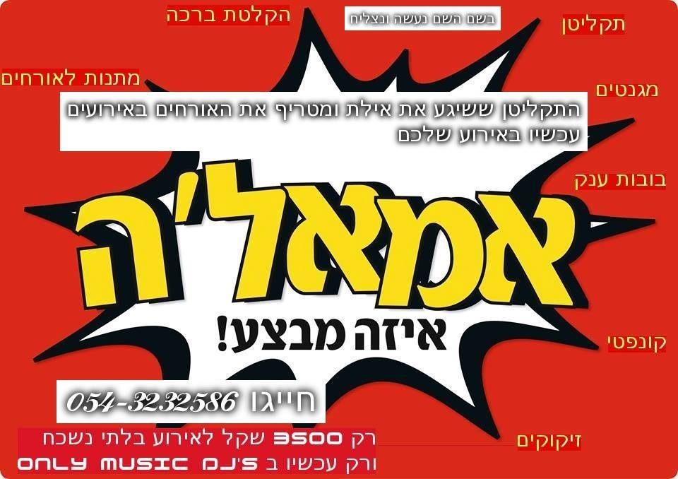 תקליטן+צילום מגנטים+בובות לרחבת הריקודים+זיקוקים וקונפטי+הקלטת ברכה והכל רק ב 3500 שקל ניתן להוסיף אטרקציות נוספות במחיר מיוחד בהנחיית שדרן הרדיו והתקליטן שתיקלט במלונות הכי נחשבים באילת ובמועדונים הכי גדולים שיש בארץ